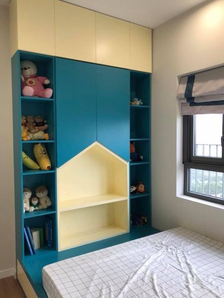 Phòng Ngủ của em bé diện tích khá khiêm tốn nên việc dùng giường liền tủ sẽ chiếm diện tích ít hơn, màu sắc tươi tắn và các ngăn tủ sau khi trang trí sẽ giúp bé thích thú hơn với căn phòng của mình.